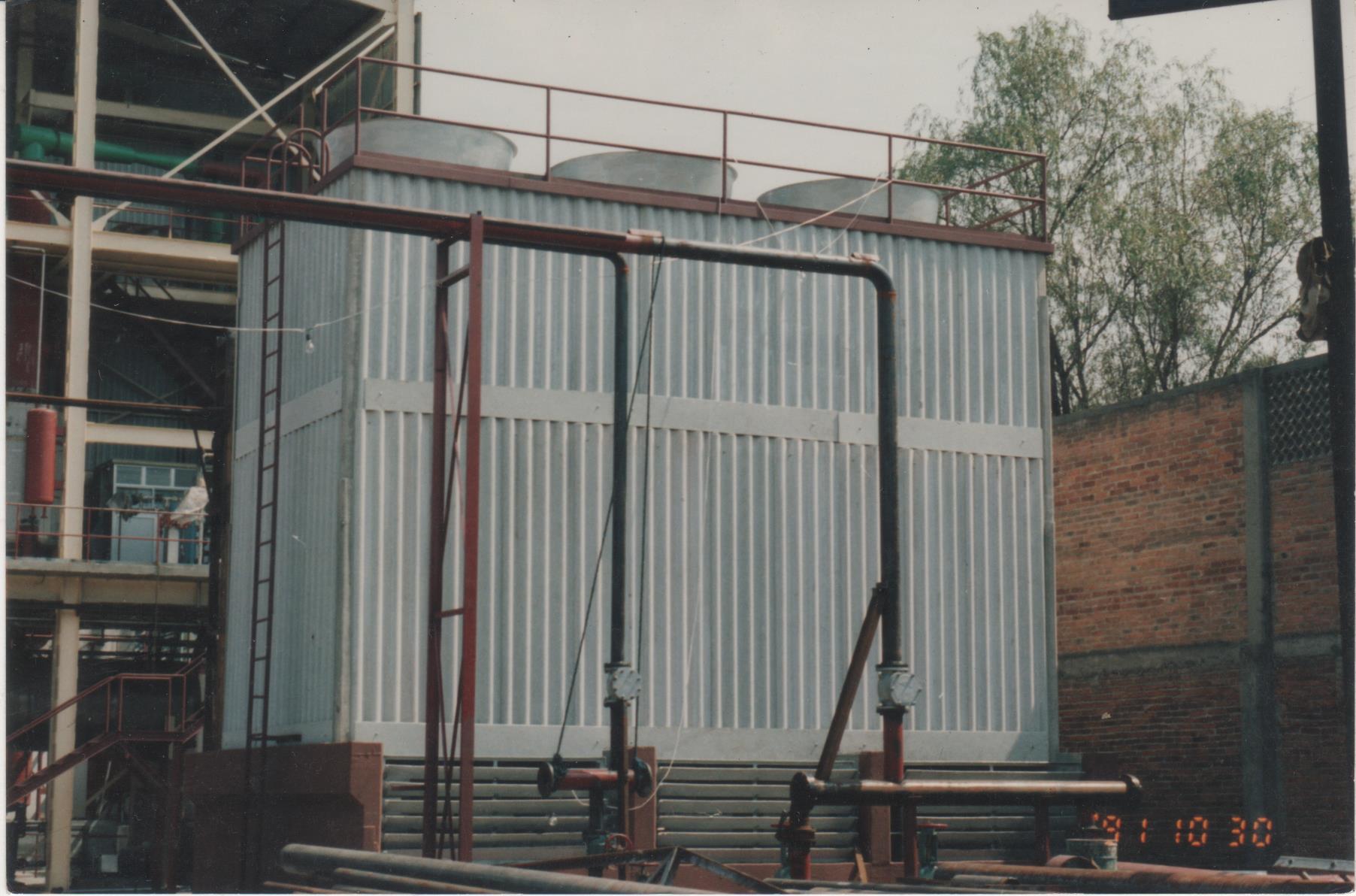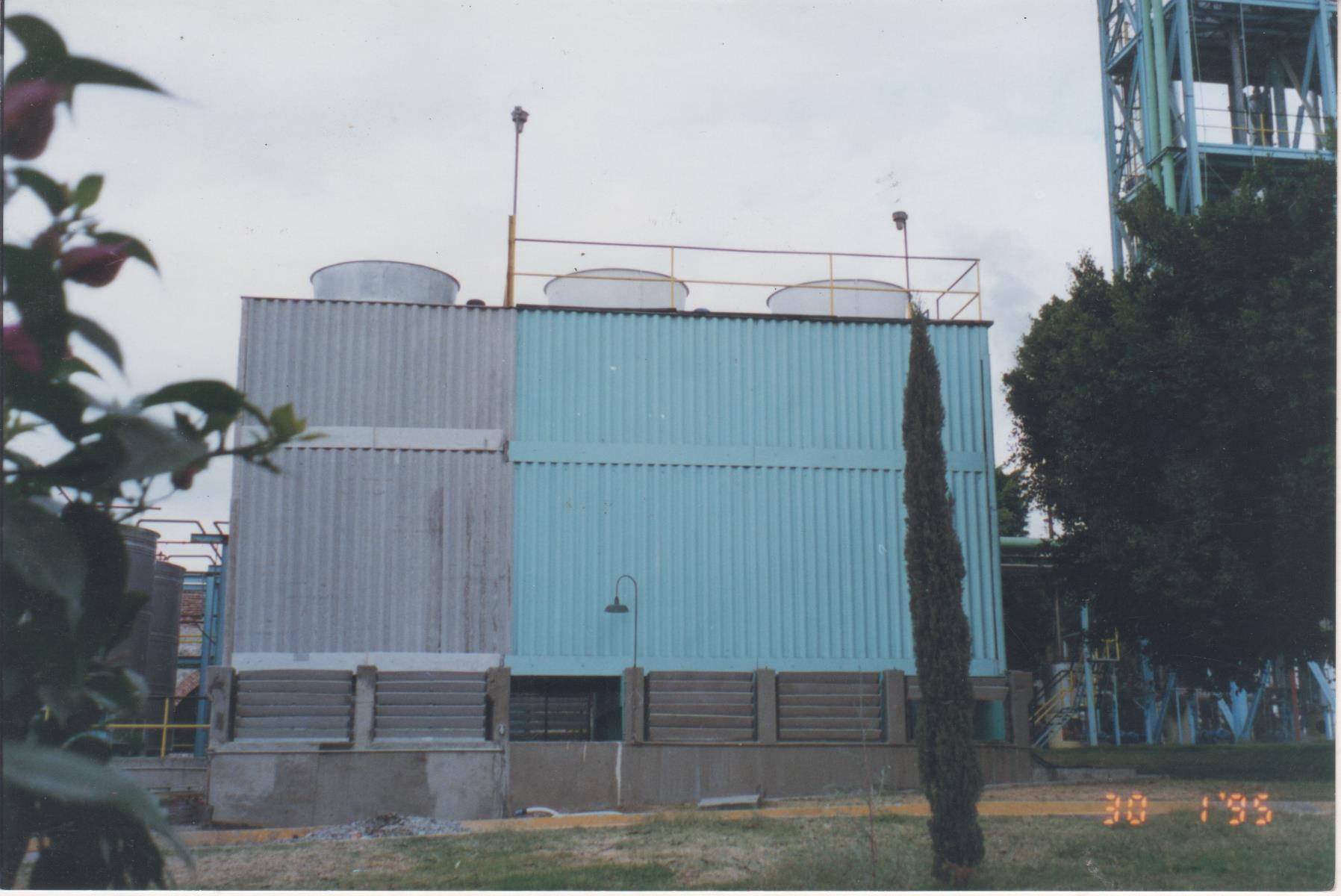 Torre multicelda estructurada el AC. galvanizado por inmersión en caliente con relleno de cerámica forros de asbesto-cemento para manejo de temperaturas arriba de 60°C y uso en la industria vitivinícola.