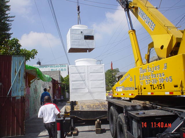 Torre de Fibra de vídrio relleno de PVC, maniobra para ensamble del cuerpo de la torre con la cisterna donde se encuentra el intercambiador de calor con tubería de cobre.
