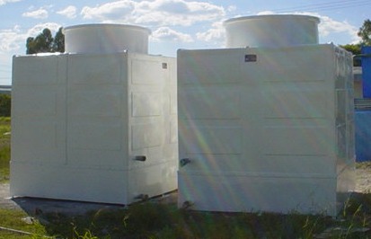 Torre multicelda fibra de vídrio con relleno de PVC. Apoyo a intercambiadores de calor.